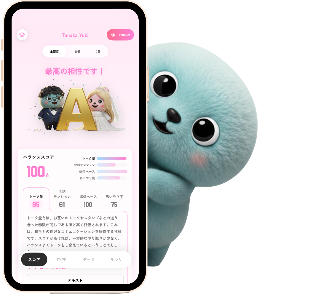 会話を分析して、ふたりの相性を100点満点のスコアで算出。A〜Eのランクとキャラクターで結果をお届け。